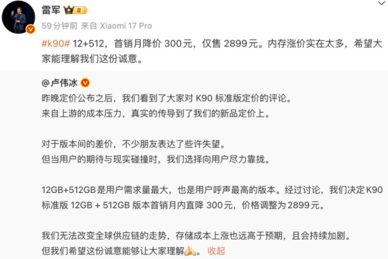 雷军也在微博上回应红米K90定价太高,原因就是因为“内存涨价实在太多”。